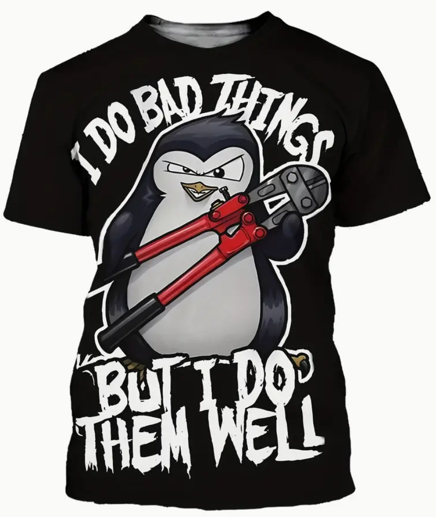 T-shirt met cartoonstijl pinguïnpatroon en alfabetprint "IK DOE SLECHTE DINGEN MAAR IK DOE ZE GOED"